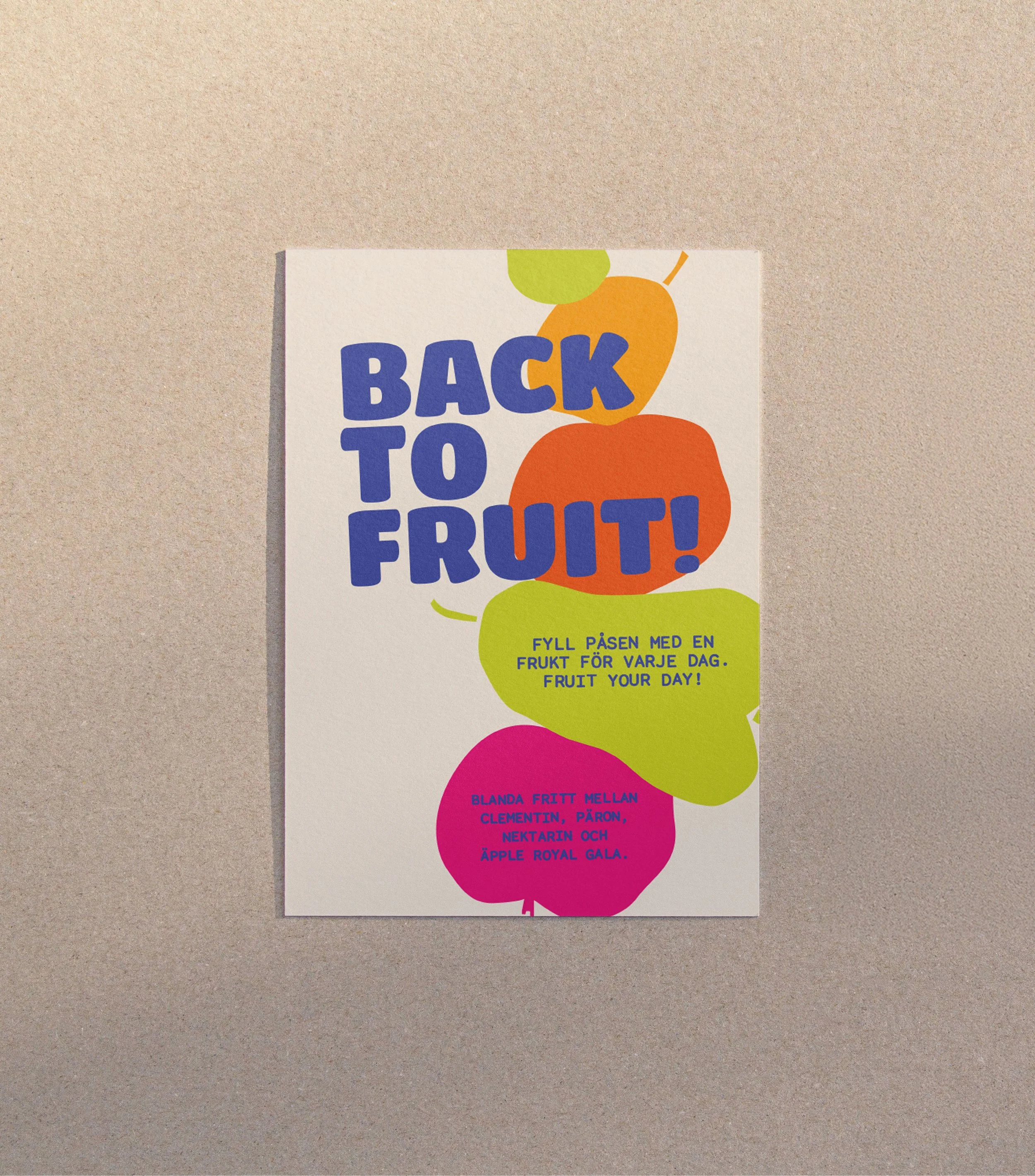 Med “Back to Fruit” har vi tagit rygg på det etablerade begreppet “Back to School”. Fruktpåse och skyltar till butik togs fram.