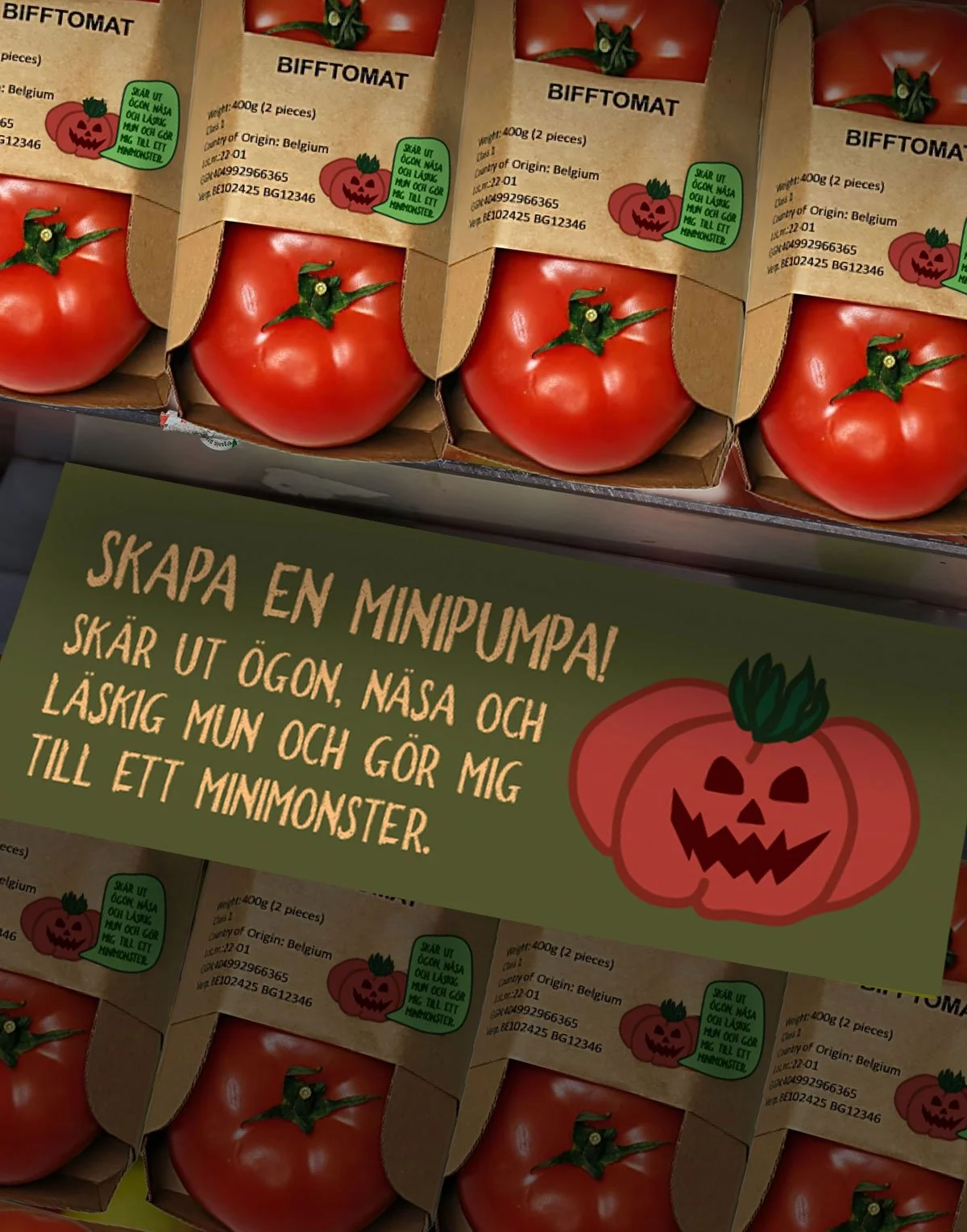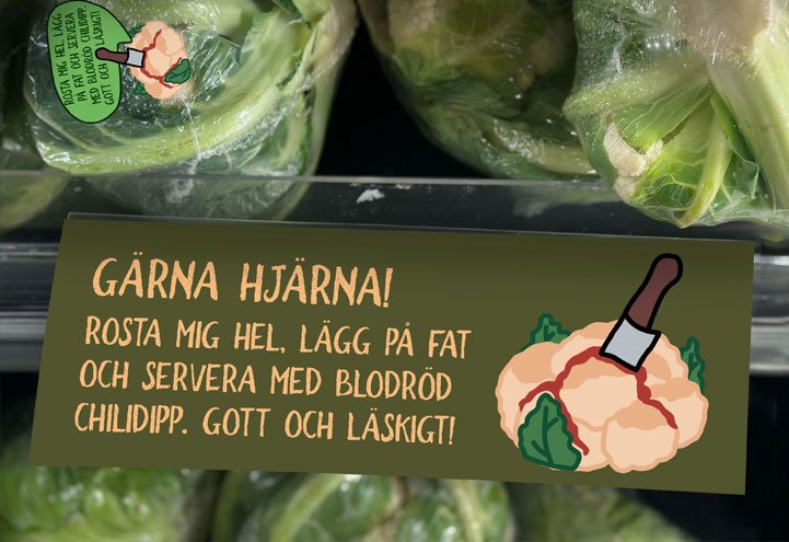 I butik tog vi fram skyltar med enkla tips som hur man skapar en läbbig hjärna av ett blomkåls huvud, en läskig dödskalle av en champinjon eller hur man gör läskiga monster av bifftomaterna. Aldrig har grönsaker varit roligare att sätta på bordet.